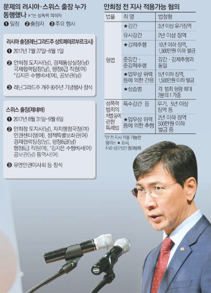 첫 성폭행 이후 안 전 지사의 러시아·스위스 해외 출장은 그의 머릿속에서 양심을 지우는 기폭제가 됐을 것으로 추정된다. 지난해 충남도지사 해외 방문 일정 자료에 따르면 안 전 지사는 지난해 7월 27일부터 8월 1일까지 있었던 러시아 레닌그라드주 상트페테르부르크시를 방문하는 일정에 수행비서 김씨를 대동했다. 수행 일정 후 밤, 숙소에서 성폭행을 당했다는 김씨 증언에 따르면 두 번째 비극은 도지사 출장단이 머물렀던 5성급 '앙글르테르 호텔'일 확률이 높다.