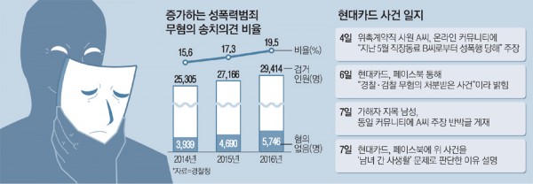 9일 경찰청에 따르면 지난해 경찰이 검거한 성폭력 범죄자 2만9414명 중 무혐의 처분(송치의견 기준)을 받은 인원은 5746명으로 전체 인원의 19.5%에 달했다. 성폭력 혐의로 입건된 5명 중 1명이 무혐의 처분을 받은 셈이다. 성폭력 사건 무혐의 처분 비율은 2014년 15.6%에서 2015년 17.3%, 지난해 19.5%로 매년 증가하고 있다.